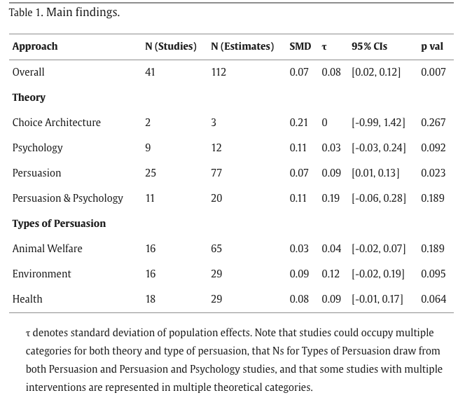 The interventions that we included in the analysis fell into four categories: 1) persuasion efforts (and its three sub-categories of animal welfare, environmental, and health appeals), 2) choice architecture (moving items around on a menu or making it more difficult to serve yourself fish sauce by placing a hole in the serving spoon), 3) psychology (typically norms appeals, but also response inhibition training), and 4) combinations of persuasion and psychology. Some of the papers included multiple categories of interventions that were contrasted against each other and some interventions combined multiple categories together (e.g., health and environmental reasons for cutting back on meat consumption).